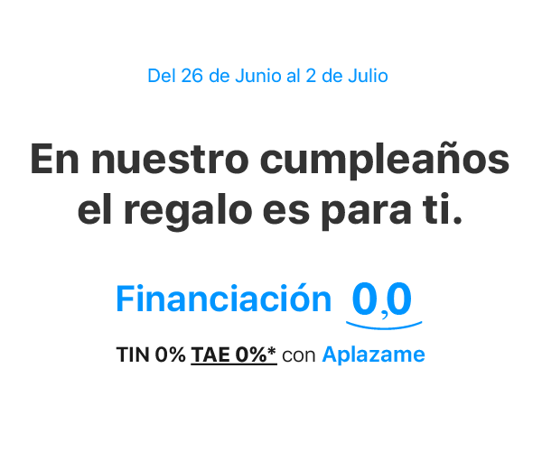 2. *Ejemplo de financiación con APLAZAME para una compra de 719,00 € a 36 meses y que comienza a pagar a los 30 días de la solicitud. Se solicita una entrada de 57,52 € que el usuario debe pagar a través de su tarjeta en el momento en que realiza la operación. El importe a financiar es la diferencia entre el valor de la cesta (719,00 €) y la entrada (57,52€): 661,48 €. Se solicitan 36 mensualidades de 18,37 €. Comisión de apertura: 0,00€. TIN: 0,00%; TAE: 0,00%. Importe total adeudado: 661,48 €. Sujeto a la aprobación por parte de APLAZAME.