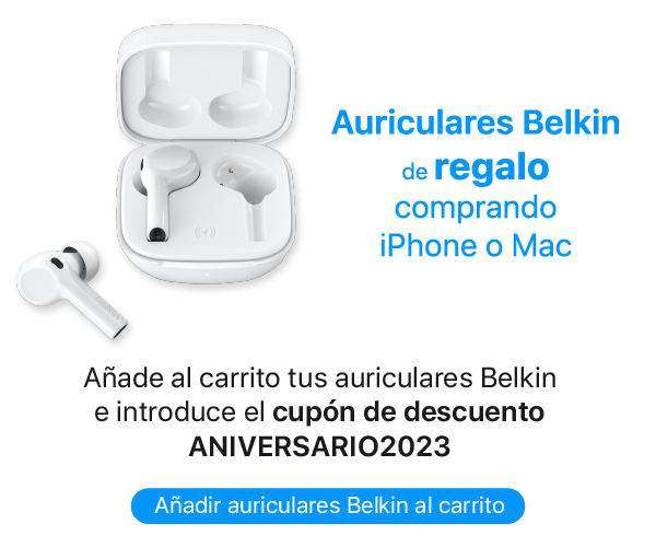 Añade los Auriculares Belkin (sigue este enlace) junto a tu compra que incluya un iPhone o Mac, y añade en el pago, el cupón de descuento ANIVERSARIO2023 y te saldrán los auriculares Belkin SoundForm Flow gratis.