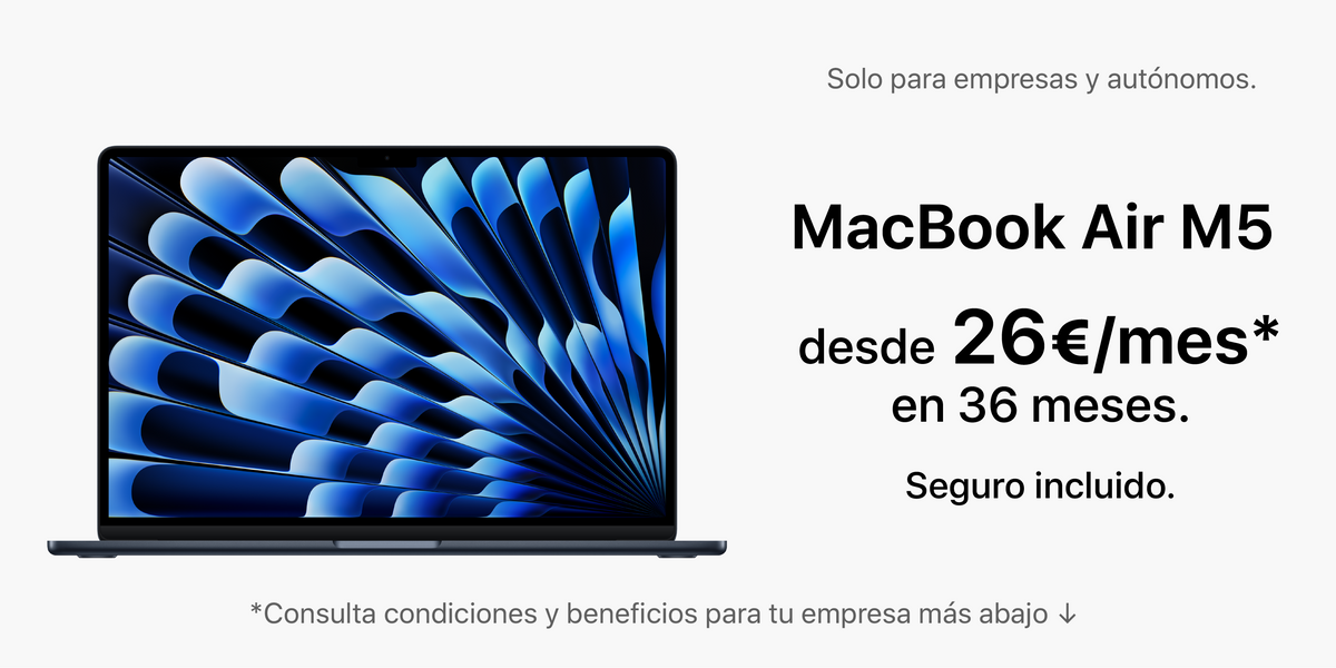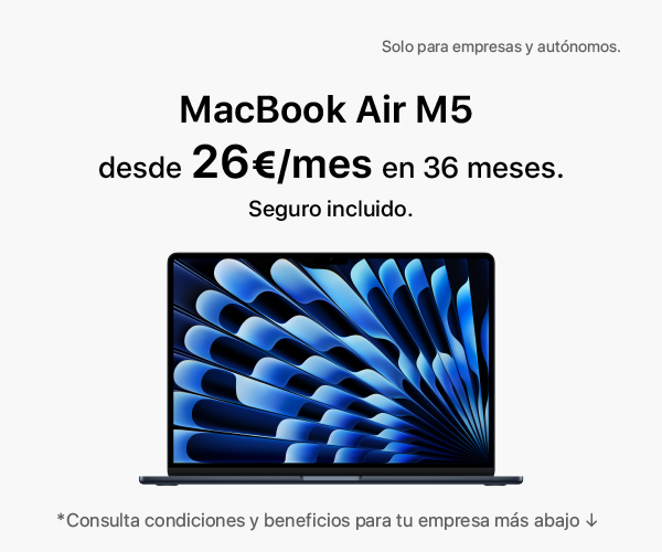 · Utiliza MacBook Air 13" M5 | 16GB memoria | 512GB SSD (MDHE4Y/A) durante 36 meses con una solución de renting pensada para pymes. (Importes IVA no incluido). Para autónomos, concesión sujeta a validación económica según documentación aportada.