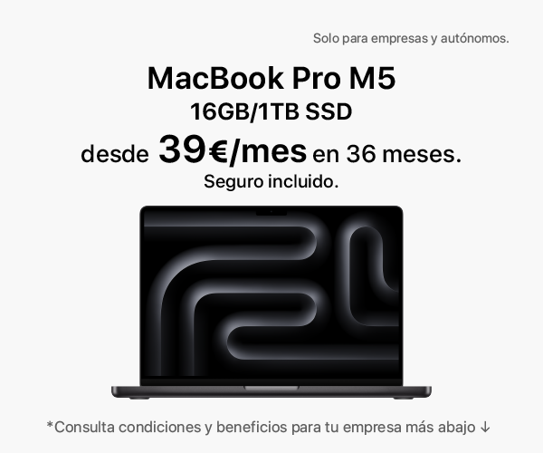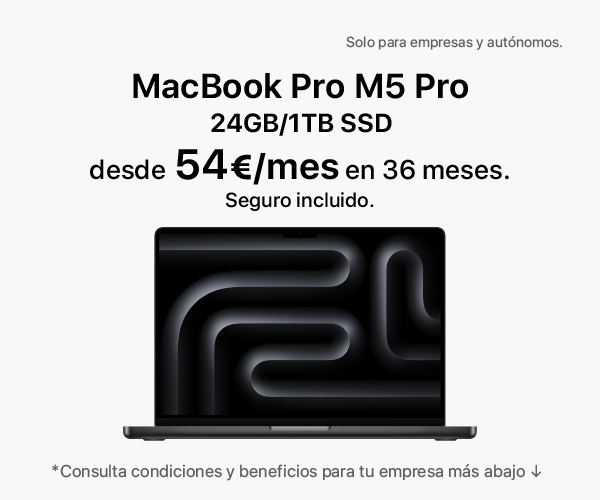 · Utiliza MacBook Pro 14" M5 Pro | 24GB memoria | 1TB SSD (MGDR4Y/A) durante 36 meses con una solución de renting pensada para pymes. (Importes IVA no incluido). Para autónomos, concesión sujeta a validación económica según documentación aportada.