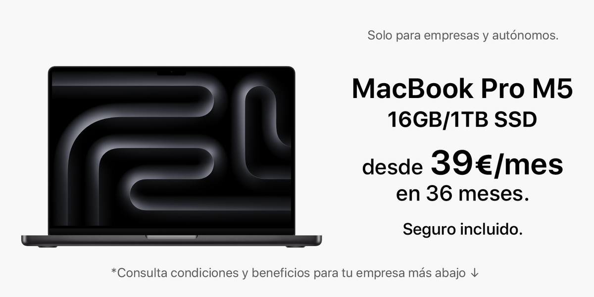· Utiliza MacBook Pro 14" M5 | 16GB memoria | 1TB SSD (MDE14Y/A) durante 36 meses con una solución de renting pensada para pymes. (Importes IVA no incluido). Para autónomos, concesión sujeta a validación económica según documentación aportada.