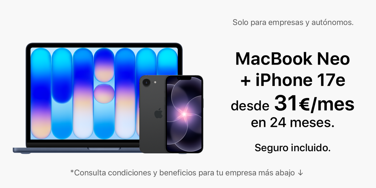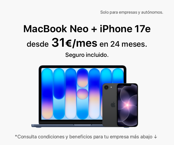 · Utiliza MacBook Neo 256GB junto con iPhone 17e 256GB (MHHF4Y / MHRV4QL/A) durante 24 meses con una solución de renting pensada para pymes. (Importes IVA no incluido). Para autónomos, concesión sujeta a validación económica según documentación aportada.